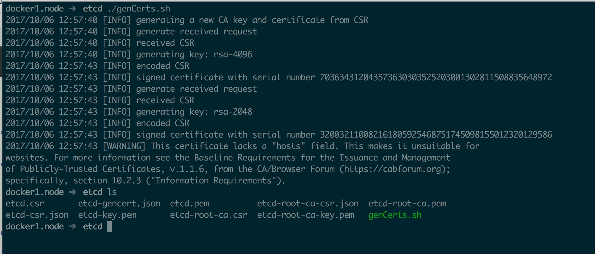cfssl gencert --ca etcd-root-ca.pem --ca-key etcd-root-ca-key.pem --config etcd-gencert.json etcd-csr.json | cfssljson --bare etcd