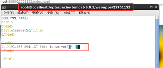在两台tomcat服务器下webapps目录下创建文件夹21751152,新建index.html文件,index.html文件内容分别如下: