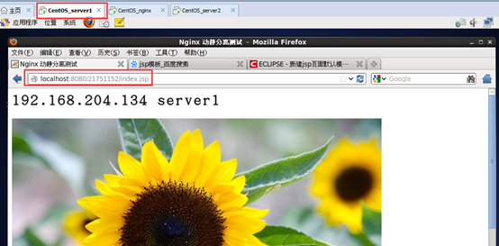 可以看到,向日葵这张图片作为静态文件,没被加载出来。这是因为静态资源访问请求已经被Nginx拦截,由Nginx进行处理。但是Nginx服务器的 /usr/local/webapps 目录下并没有图片资源,所以图片没有加载出来。index.jsp页面能够显示,说明动态的请求已经转发到了Tomcat,Tomcat对index.jsp进行了解析。