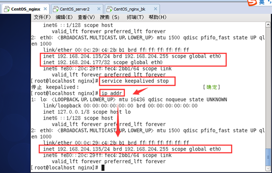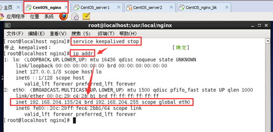用service keepalived stop 命令将Nginx主机服务的keepalived服务停止。