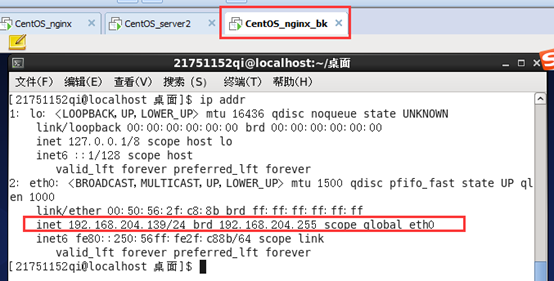 当nginx_bk主机中keepaliv服务正常开启的情况下,而nginx服务停止的情况下,该虚拟机是没有绑定虚拟ip的
