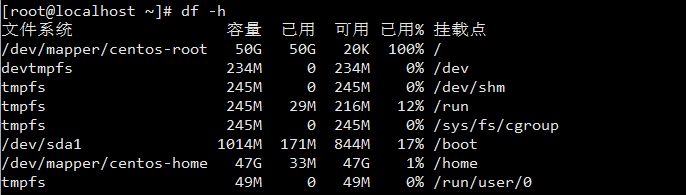 发现虽然给了这个CentOS100G的磁盘空间,但root只有50G的可用空间,剩下的空间大都分配给了/home。