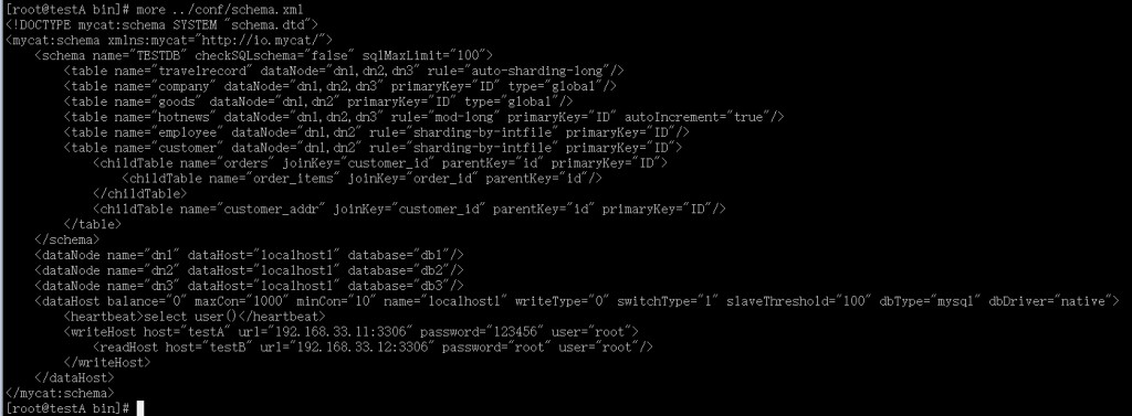 <?xml version="1.0"?> <!DOCTYPE mycat:schema SYSTEM "schema.dtd"> <mycat:schema xmlns:mycat="http://io.mycat/"> <schema name="TESTDB" checkSQLschema="true" sqlMaxLimit="100" dataNode="dn1"></schema> <dataNode name="dn1" dataHost="node1" database="test" /> <dataHost name="node1" maxCon="10" minCon="5" balance="1" writeType="0" dbType="mysql" dbDriver="native" switchType="1"> <heartbeat>select user()</heartbeat> <writeHost host="master1" url="127.0.0.1:3306" user="root" password="mysql"> <readHost host="slave2" url="127.0.0.1:3307" user="root" password="mysql" /> <readHost host="slave3" url="127.0.0.1:3308" user="root" password="mysql" /> <readHost host="slave4" url="127.0.0.1:3309" user="root" password="mysql" /> </writeHost> <writeHost host="master2" url="192.168.56.13:3306" user="root" password="mysql"> <readHost host="slave2" url="192.168.56.13:3307" user="root" password="mysql" /> </writeHost> # (第二组主从,如无,请注释忽略) </dataHost> </mycat:schema>